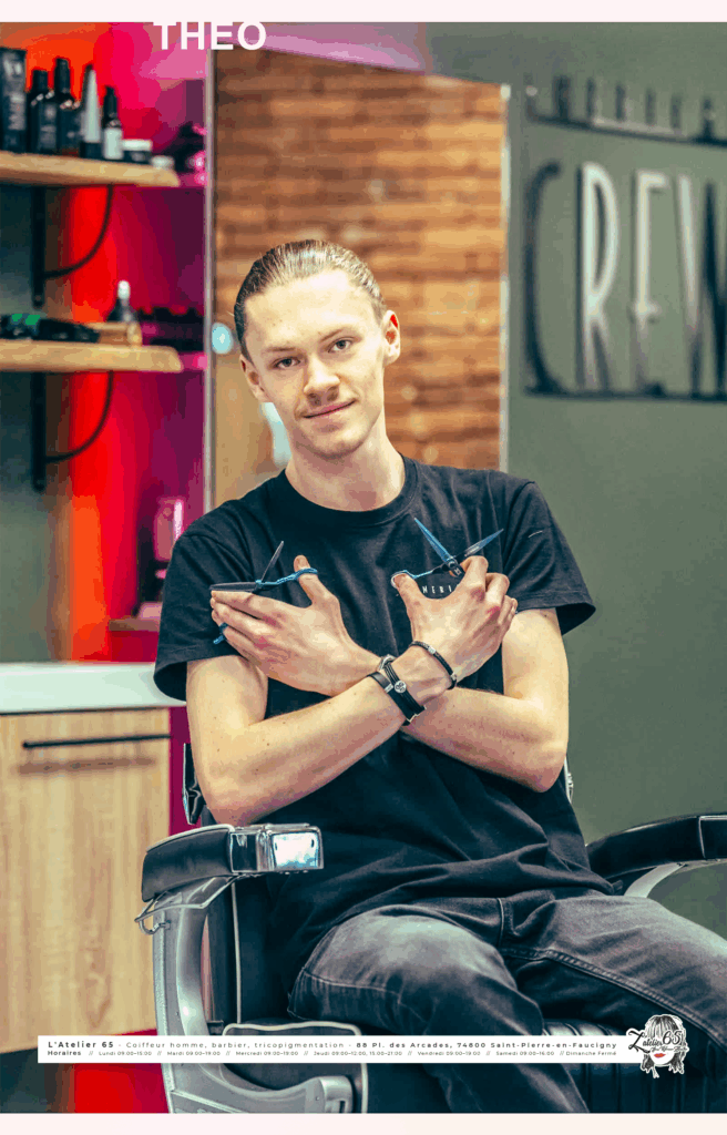 Coiffeur mixte depuis 2020, Théo trace sa route avec une ambition claire : progresser sans relâche pour devenir un excellent coiff eur. Arrivé à l’Atelier 65 en 2023, il a trouvé un terrain de jeu et d’apprentissage à sa mesure.