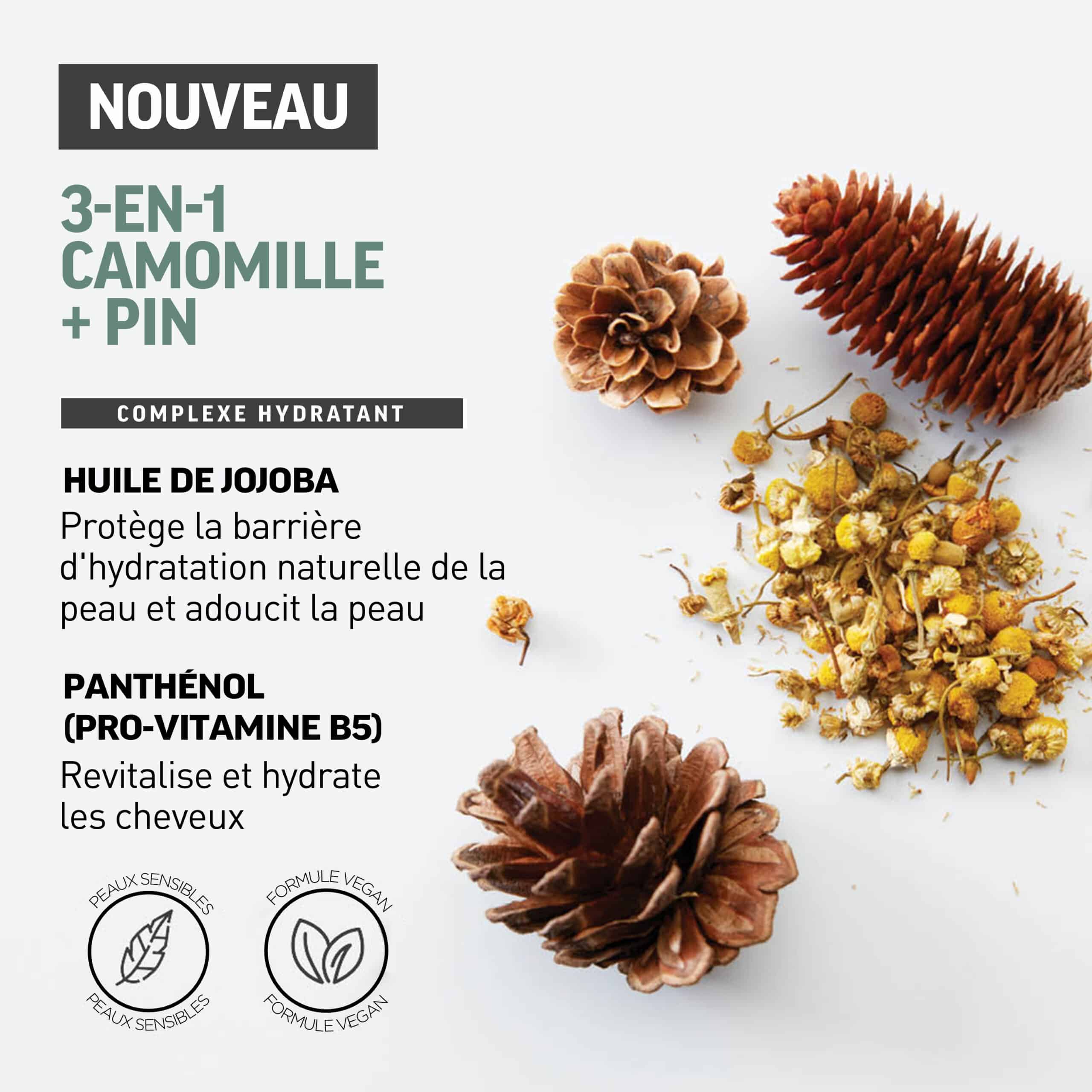 Simplifiez votre routine de soins capillaires et corporels avec notre solution polyvalente 3-en-1 Camomille + Pin.