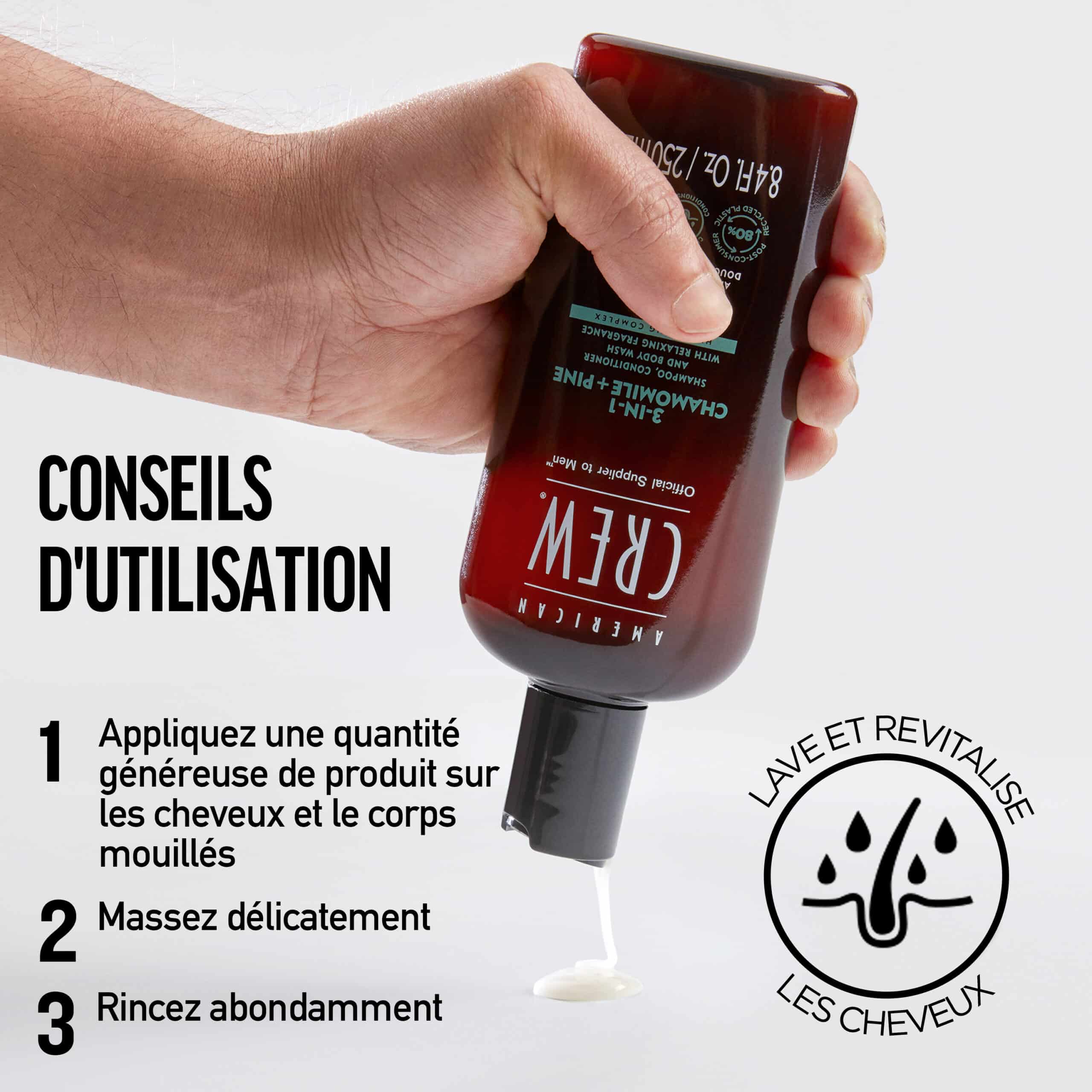 Le shampooing, l’après-shampooing et le gel douche 3-en-1 Camomille + Pin d’American Crew est un produit tout-en-un qui élimine efficacement les huiles, laissant les cheveux propres, revitalisés, brillants et doux. Il confère une sensation de douceur à votre peau, tandis que le parfum revitalisant de camomille et de pin offrent une expérience vraiment rafraîchissante.