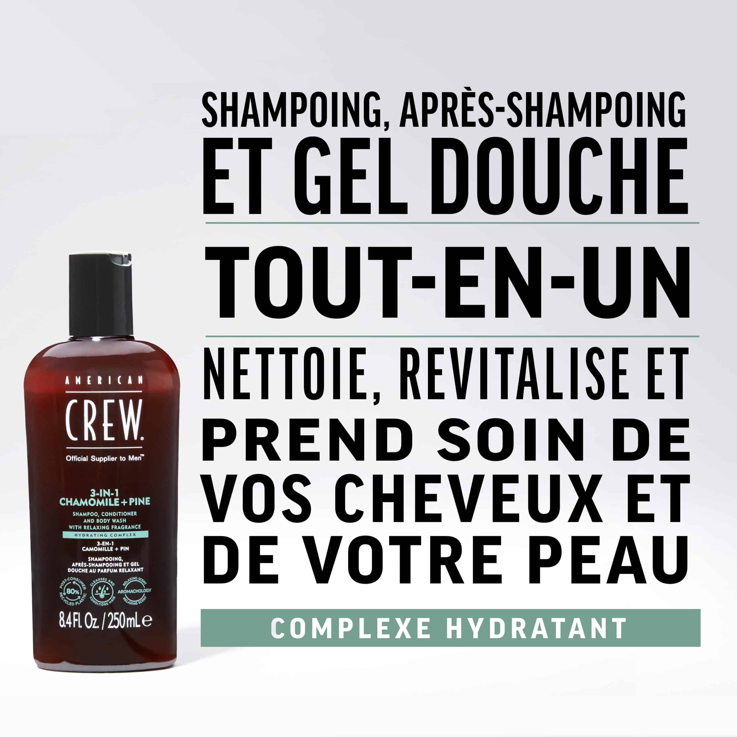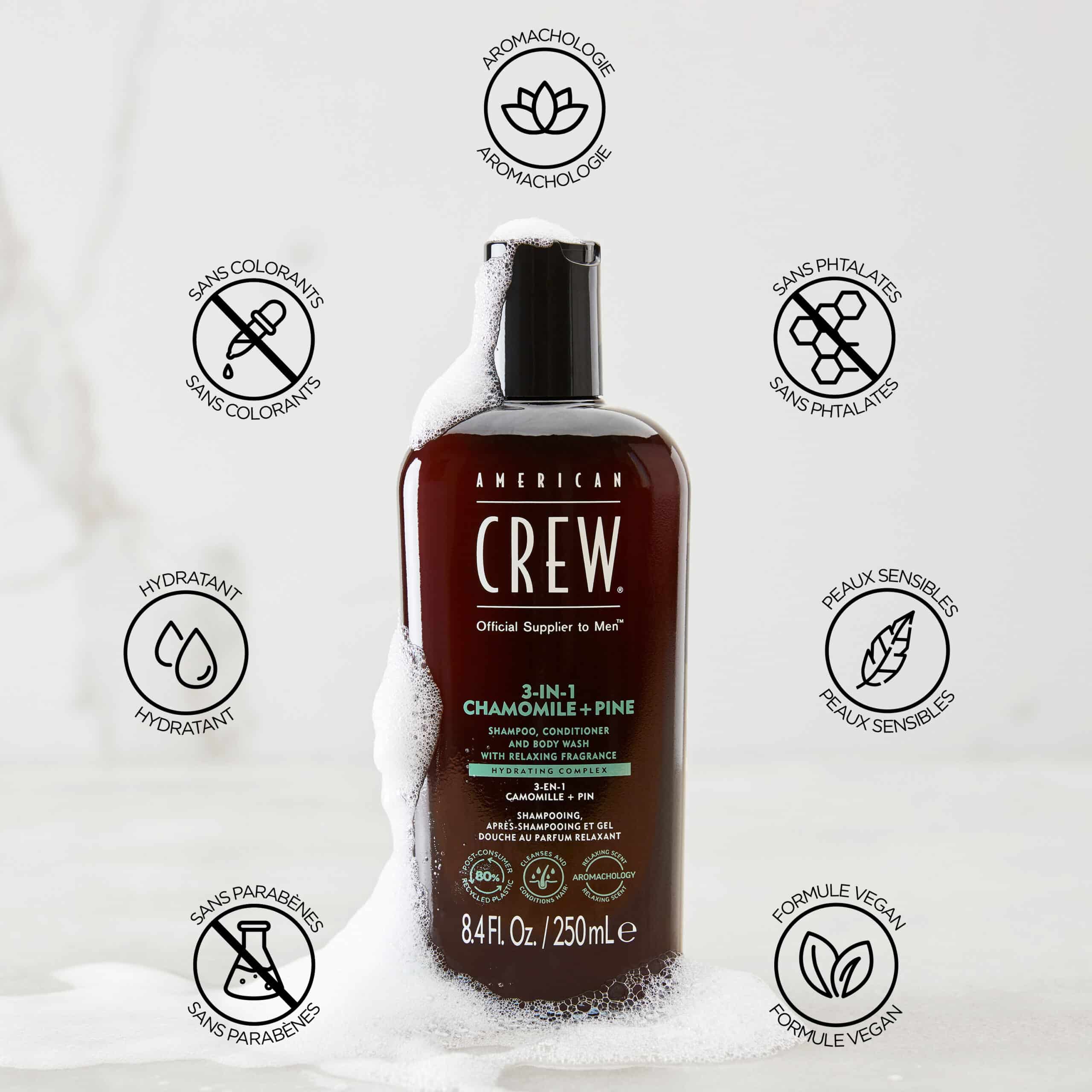 - American Crew 3-En-1 Camomille et Pin, Shampooing, Après Shampooing & Gel Douche pour Cheveux et Corps (250ml), Revitalisant, hydratant et apaisant. -