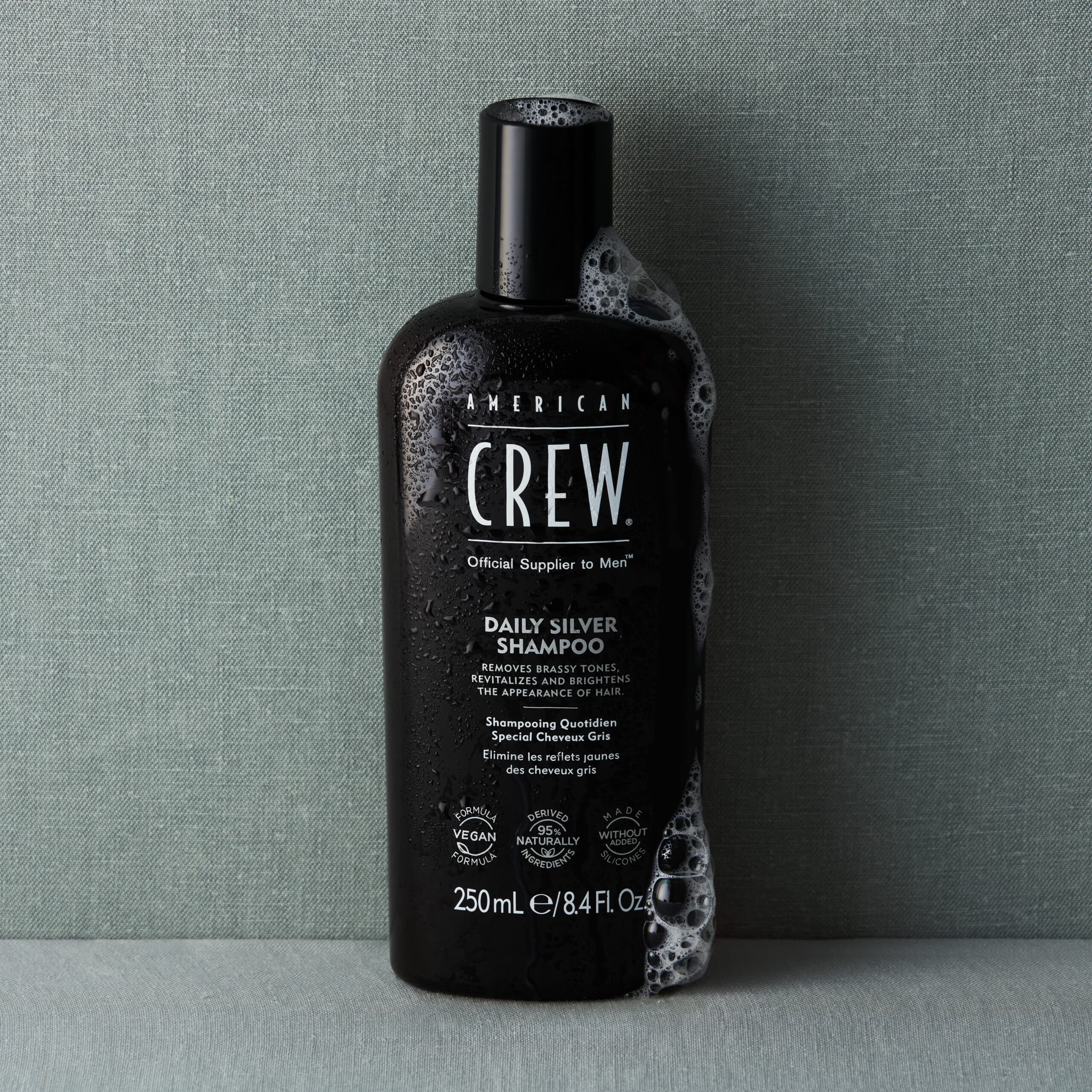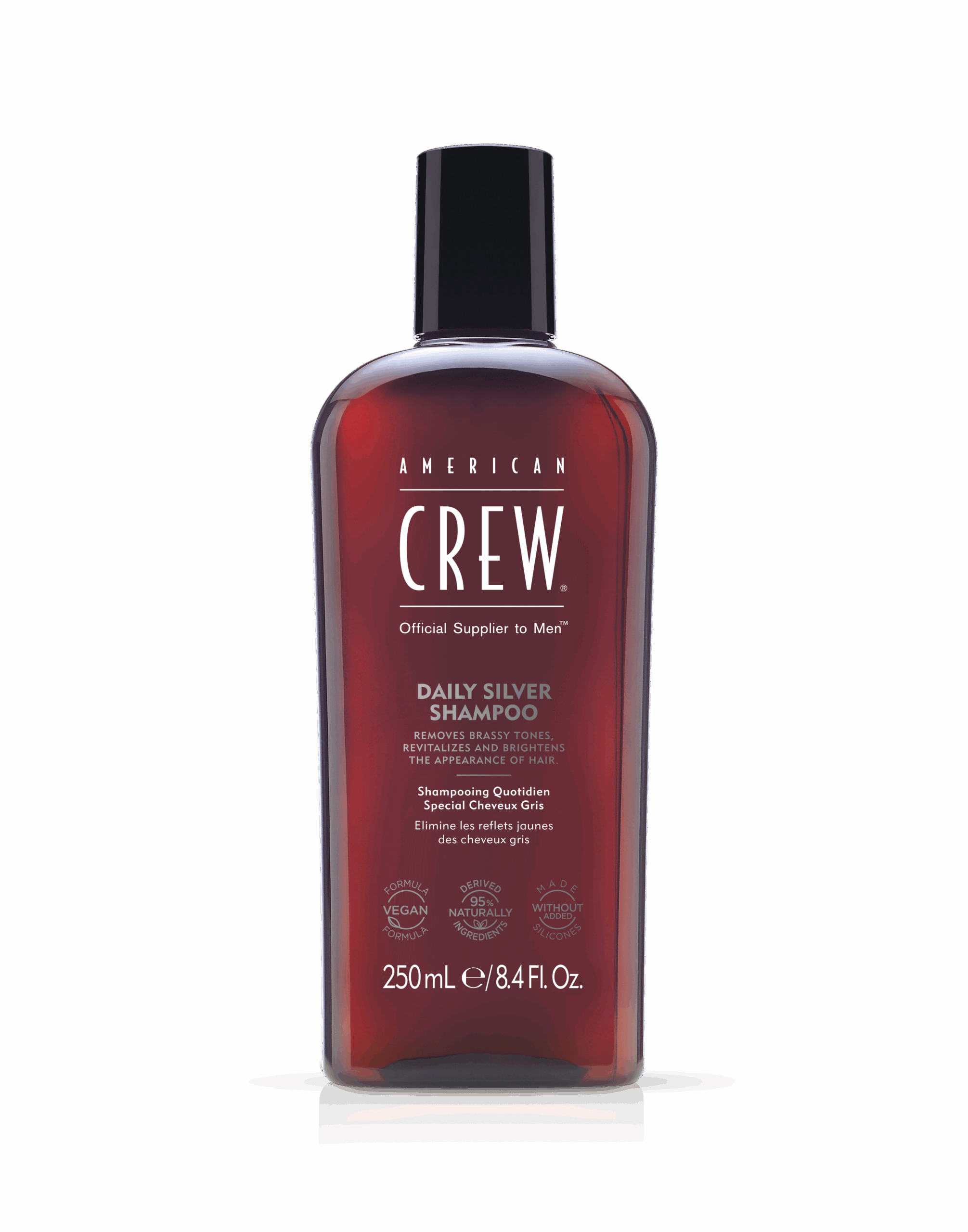 Ce nouveau shampooing à la formule améliorée sublime les cheveux gris, blancs et blonds. Sa formule unique et améliorée est enrichie en pigments violets pour neutraliser les effets cuivrés et jaunis indésirables des cheveux aux tons froids. Dernier né de la gamme complète de soins capillaires d’American Crew, le Daily Silver Shampoo agit pour illuminer, revitaliser et hydrater les cheveux gris, tout en offrant une protection contre la décoloration UV et oxydative.